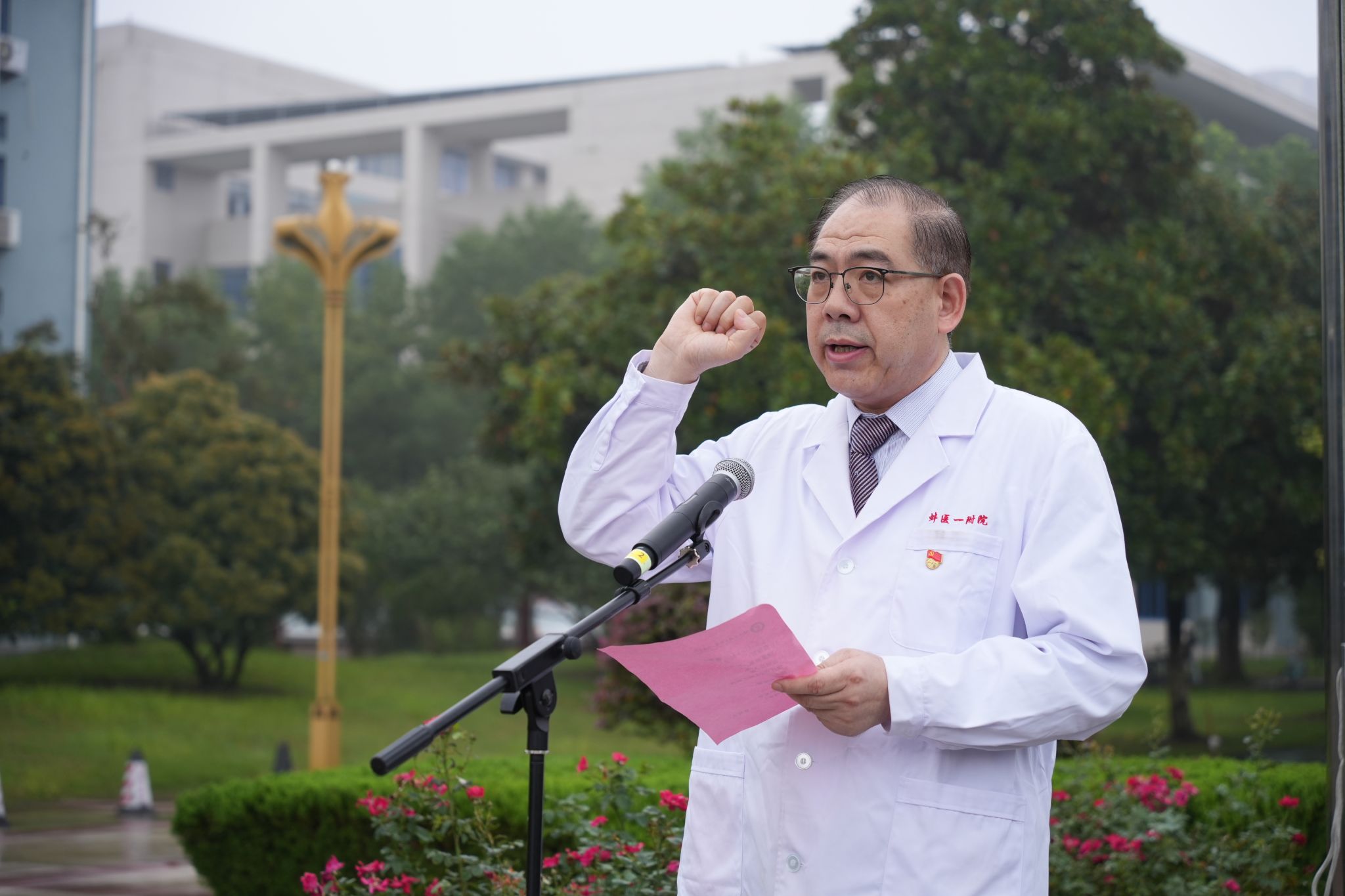 第一临床医学院(第一附属医院)党委书记胡建国领誓《医学生誓言》。全体学生高举右拳,齐声跟诵,抒发了蚌医学子决心为祖国医药卫生事业的发展和人类身心健康奋斗终生的坚定信念与崇高追求。