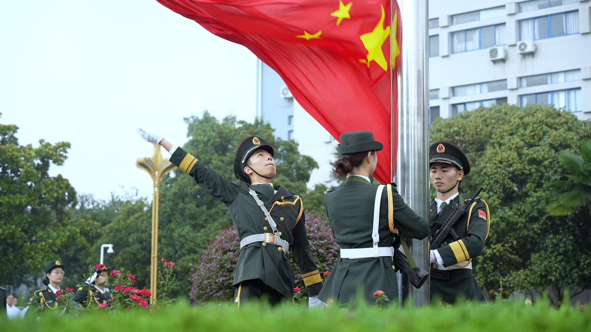 在全体师生的注目礼下,国旗护卫队迈着铿锵有力的步伐,护卫着五星红旗走向升旗台。伴随着雄壮激昂的《义勇军进行曲》,鲜艳的五星红旗冉冉升起,迎风飘扬。全体师生齐声高唱国歌,抒发对祖国母亲的礼赞与祝福。