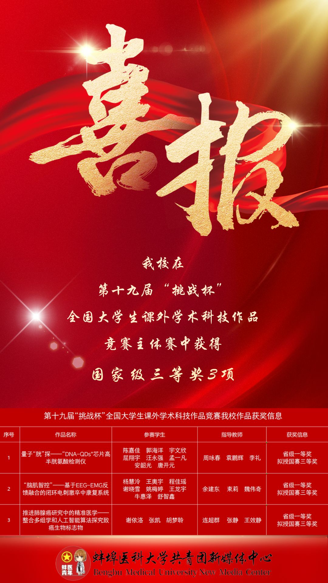 近日,第十九届“挑战杯”全国大学生课外学术科技作品竞赛圆满落幕。我校三项省级一等奖作品《“脑肌智控”——基于EEG-EMG反馈融合的闭环电刺激卒中康复系统》《推进肺腺癌研究中的精准医学——整合多组学和人工智能算法探究致癌生物标志物》以及《量子“胱”探——“DNA-QDs”芯片高半胱氨酸检测仪》入围国赛,并荣获全国三等奖,实现我校在参与该项竞赛中的最佳成绩!