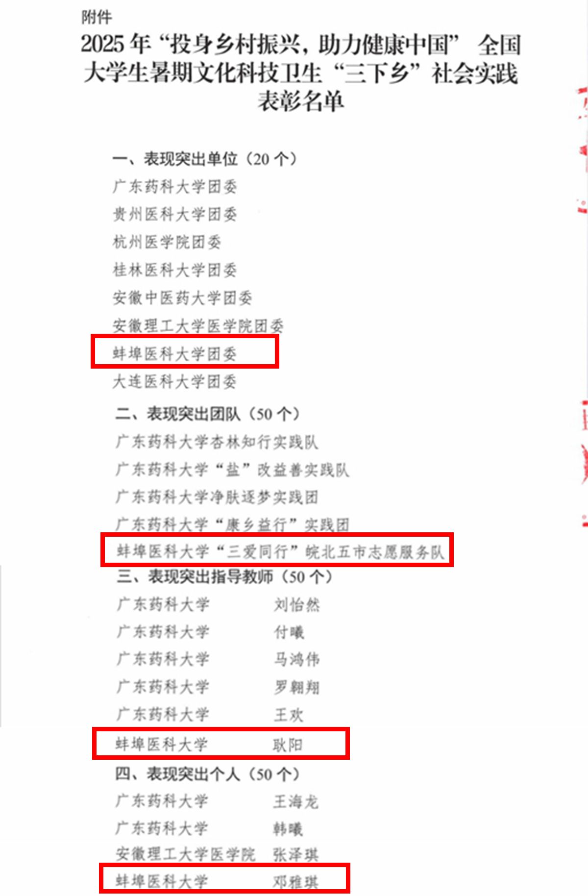 近日,2025年“投身乡村振兴,助力健康中国”全国大学生暑期文化科技卫生“三下乡”社会实践专项活动评比结果公布,我校团委荣获“表现突出单位”称号,“三爱同行”皖北五市志愿服务队被评为“表现突出团队”,第一临床医学院(第一附属医院)耿阳老师获评“表现突出指导教师”,检验医学院邓雅琪同学获评“表现突出个人”。