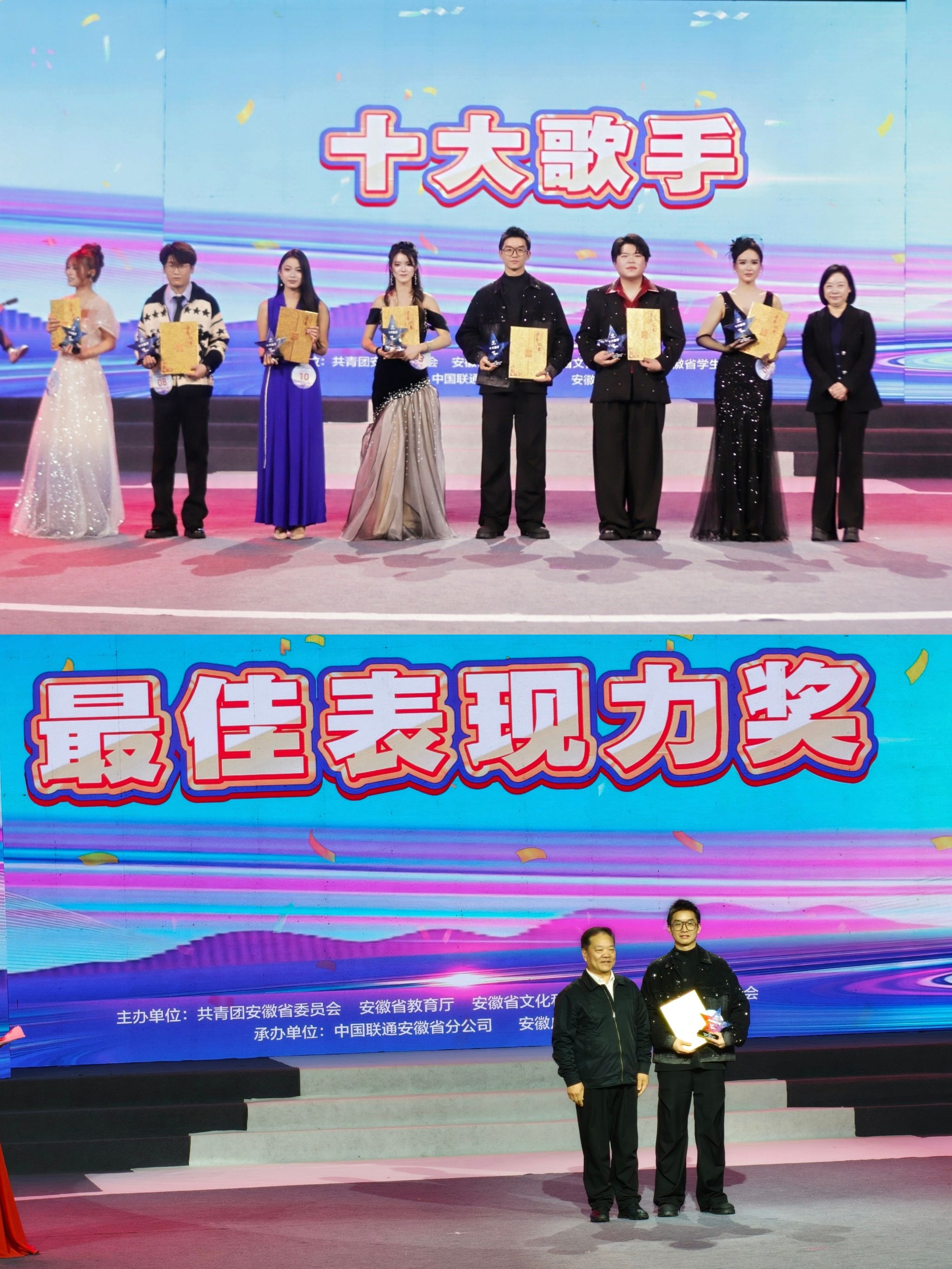 1月26日,由共青团安徽省委员会、安徽省教育厅、安徽省文化和旅游厅、安徽省学生联合会联合主办的2025年安徽省大学生校园十大歌手大赛总决赛,在安徽广播电视台亚洲一号演播大厅圆满落幕。我校第一临床医学院2024年级学生柯亦洋,凭借扎实的演唱功底和富有感染力的舞台表现脱颖而出,荣获安徽省“大学生校园十大歌手”和最佳表现力奖两项荣誉。