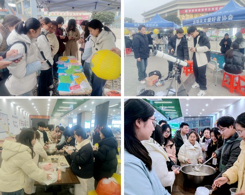 为弘扬中华优秀传统文化,丰富校园文化生活,凝聚青年力量,在农历正月十五元宵佳节之际,我校学生社团在学校团委的指导下,精心策划了包汤圆、猜灯谜、观星空、唱民谣等活动,参与学生欢聚一堂,在欢声笑语中共度佳节,感受传统民俗的独特魅力。